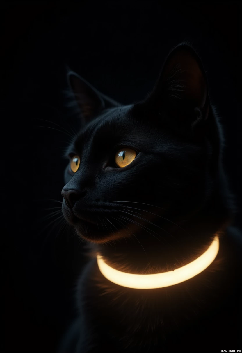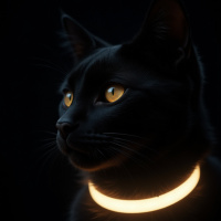 a black cat with striking yellow eyes and an illuminated collar. The cat's fur is jet-black, while its eyes are a vibrant yellow, giving it a unique appearance. A glowing collar encircles the cat's neck, adding to its