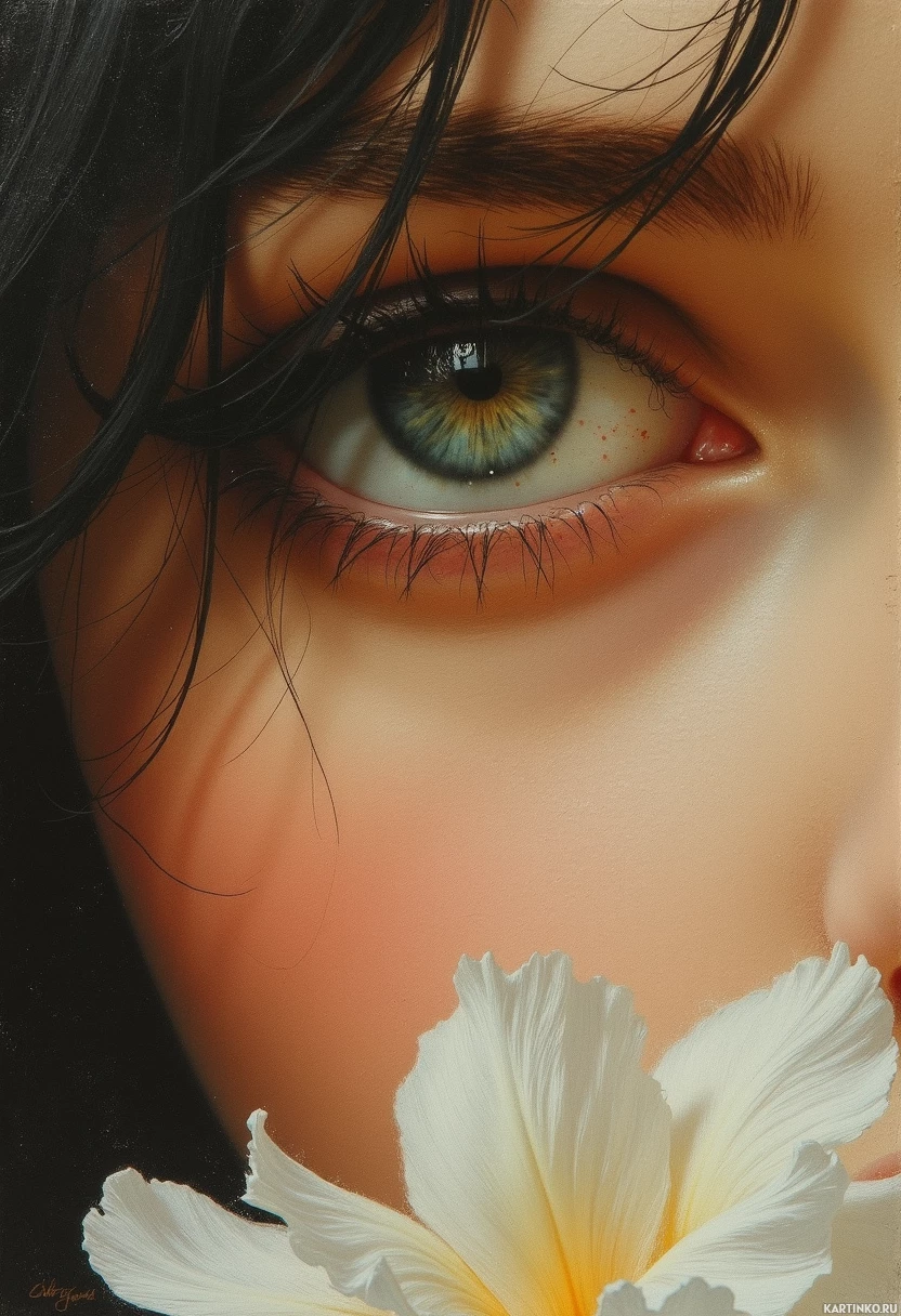 a distinctive pattern of lines and colors. + The pupil is small and circular. + The eyelids are thin and slightly raised, giving the impression that the woman is gazing intensely. * A flower: + The flower is white and delicate, with five petals that are curved outward. + It appears to be a type of lily or orchid. + The