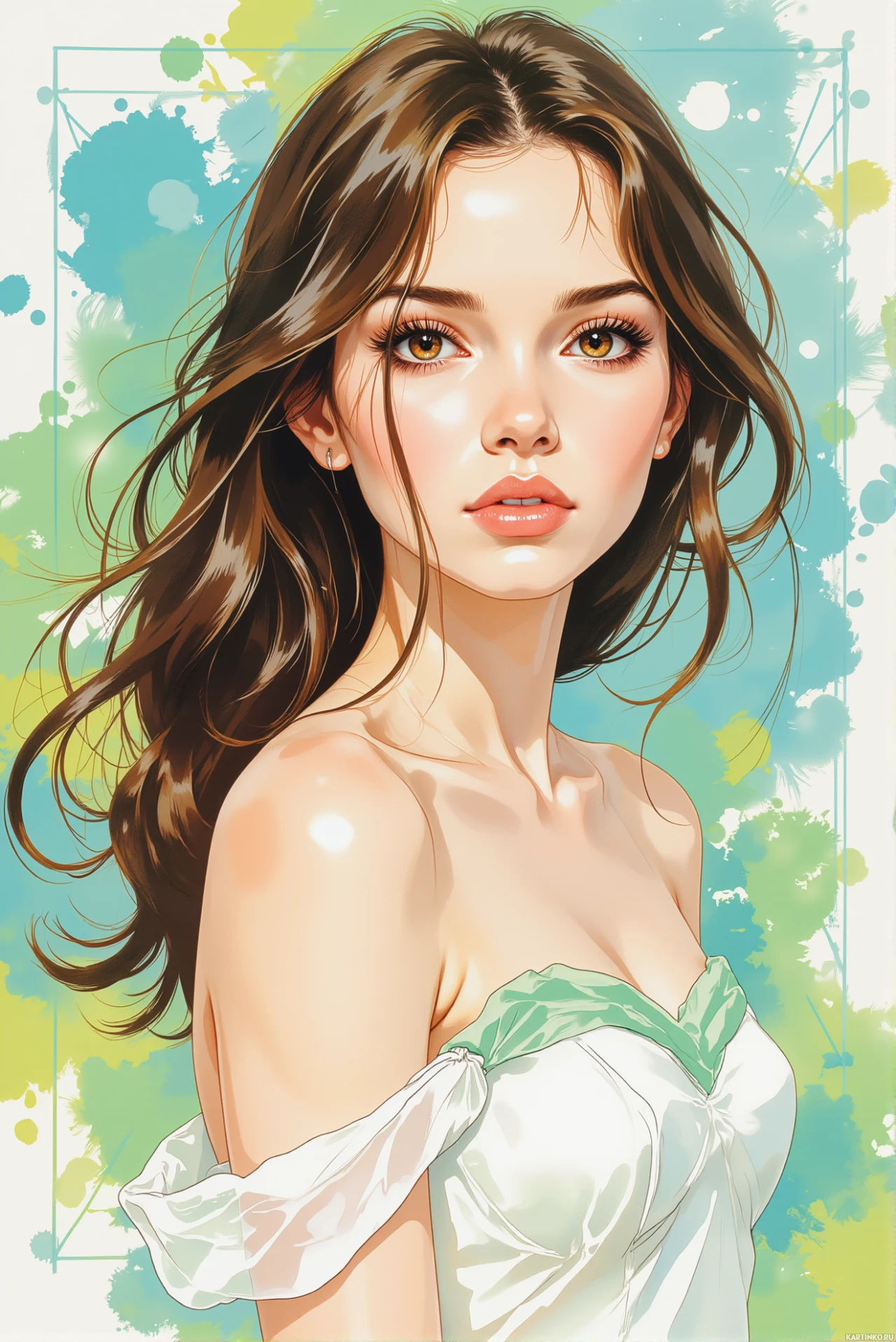a young woman with long brown hair, gazing directly at the camera. She wears an off-the-shoulder