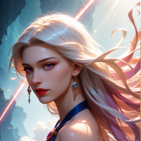 gold earrings shaped like leaves or flowers, which complement the necklace perfectly. As she stands confidently in front of a dramatic backdrop, her hair flows behind her like a golden waterfall, framing her face and shoulders. The overall effect is one of effortless beauty and poise, as if she were born to be the center of attention. The background of the image is a rich, deep blue that provides an elegant contrast to the vibrant colors of the woman's dress and accessories. It seems to be a fantasy or sci-fi setting, with swirling clouds and stars visible in the distance, adding to the sense of drama and wonder. Overall, the image exudes a sense of luxury, sophistication, and otherworldly beauty, inviting the viewer to step into its enchanting world.