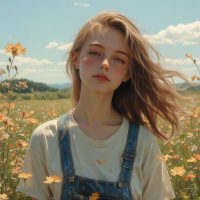 light dusting of dirt or pollen particles is scattered across her clothing, suggesting that she has been working or playing outdoors. In the background, a vast expanse of open field stretches out, dotted with wildflowers of various colors including yellow, orange, pink, purple and white. The sky above is blue and cloudy, with puffy white clouds drifting lazily by. The overall atmosphere of the image conveys a sense of serenity and tranquility, as if the woman has found peace and contentment amidst nature's beauty.