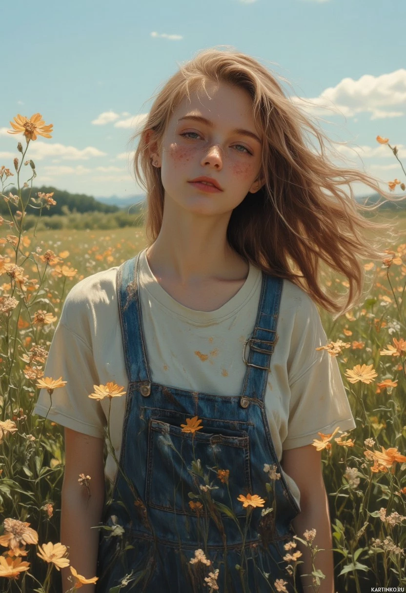 a young woman standing in a field of wildflowers, surrounded by tall grasses and vibrant blooms. She is dressed in overalls made of denim fabric, which are worn over a short-