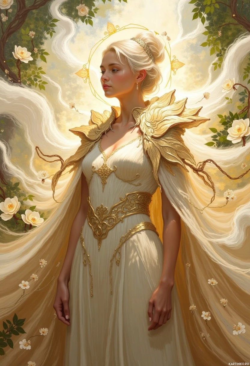 deep contemplation. The overall effect is one of serenity and grace, as if the woman is a goddess or angel come to earth.