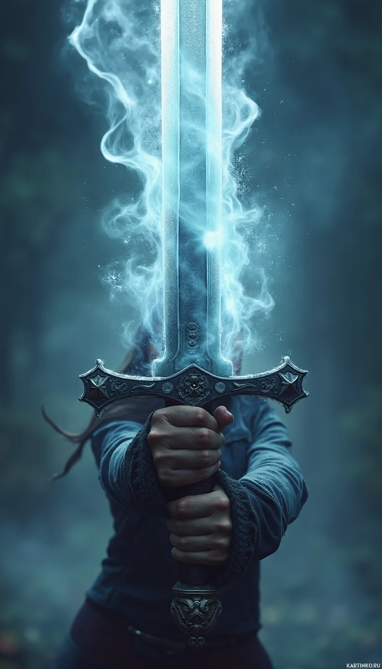The image depicts a person holding a sword in their right hand, with the blade emitting a bright