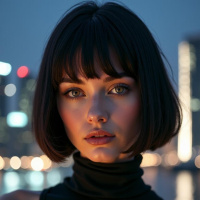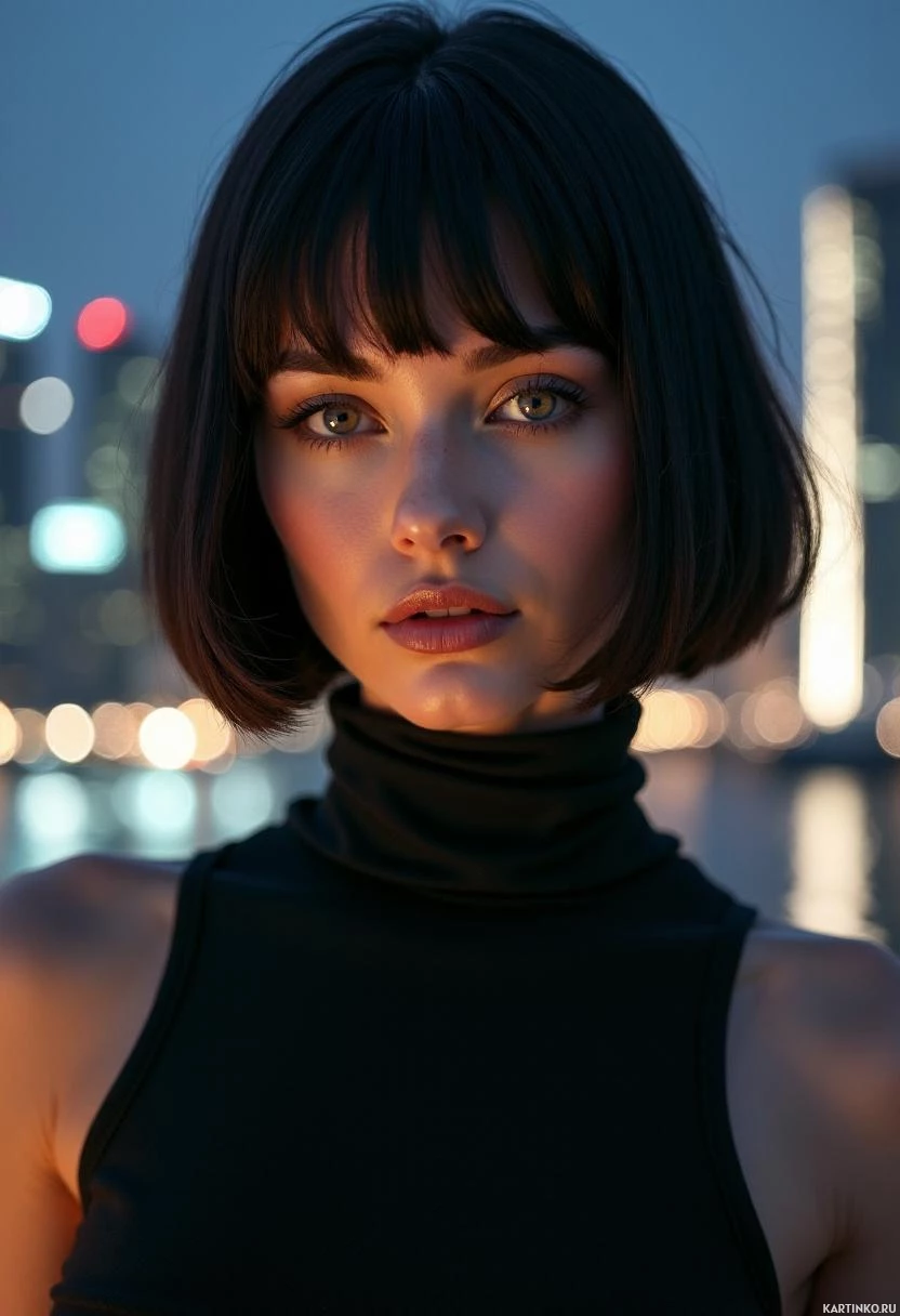 a young woman with fair skin and dark brown hair, styled in a bob with bangs. She wears a black turtleneck top made of