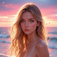 water droplets flying through the air and scattering delicate petals across the sand. The overall atmosphere exudes serenity and tranquility, inviting the viewer to step into this idyllic setting. The image is rendered in stunning detail, with crisp lines and vibrant colors that bring the scene to life. The young woman's features are finely defined, and her expression conveys a sense of peace and contentment. The beach itself appears pristine and untouched, with no signs of human activity or pollution. Instead, it seems like a private oasis, reserved solely for this beautiful young woman. The image captures a moment in time that is both fleeting and eternal. It invites the viewer to pause and appreciate the beauty of nature, to bask in the warmth of the setting sun, and to revel in the serenity of this peaceful beach scene.