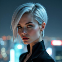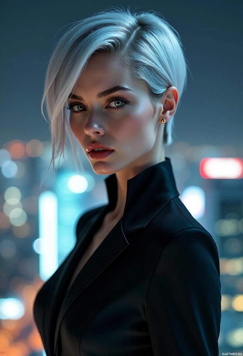 white hair, styled in an asymmetrical manner, where one side is longer than the other. Her hair is cut close to her head on the shorter side and falls just below her shoulders on the longer side. She has