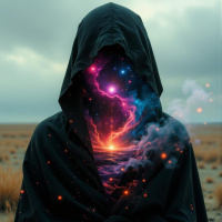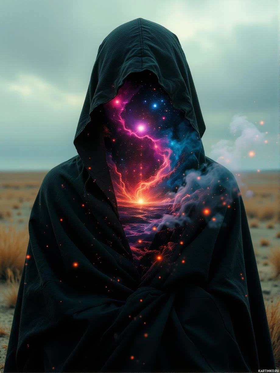 vibrant colors such as pink, blue, purple, orange, and yellow, giving it a sense of depth and dimensionality. The overall effect of the image is one of mystery and intrigue, as if the person wearing the cloak is hiding something or someone within their hood. The abstract design inside the hood adds