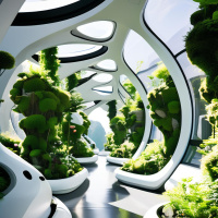 clean lines and a neutral color palette that complements the vegetation. The overall setting seems to be intended for relaxation or perhaps as part of an eco-friendly building concept.