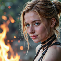 a young woman with blonde hair, wearing a black leather harness and holding a fire in her hand. The woman is dressed in a black