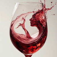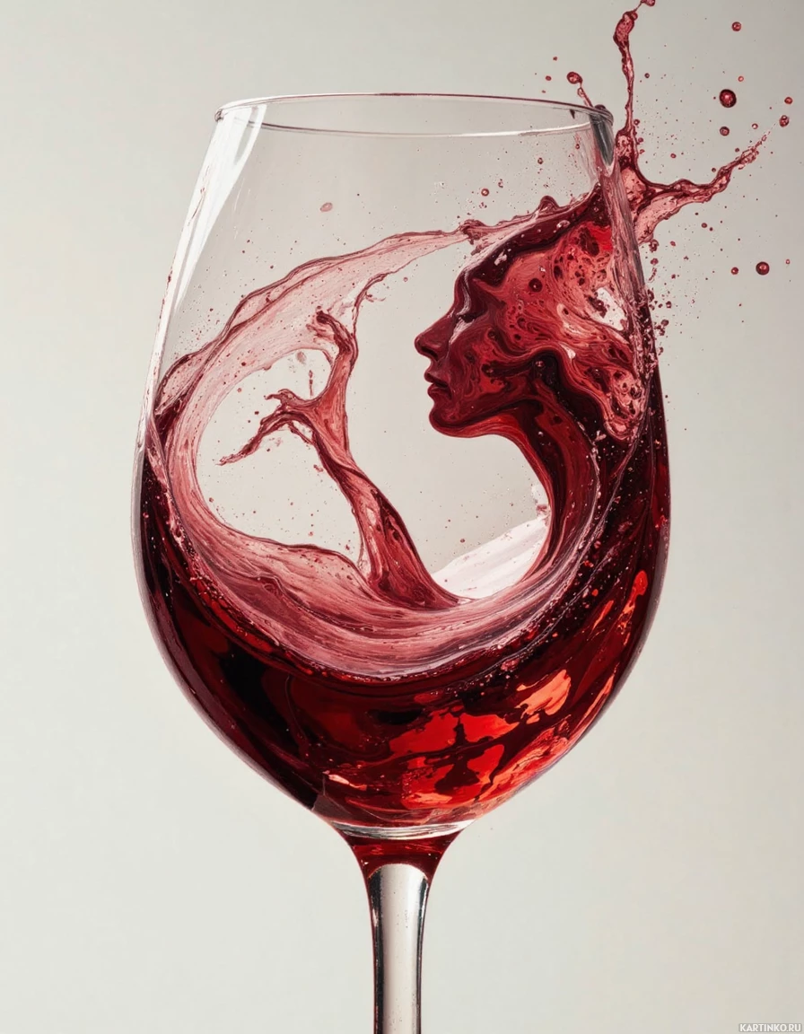 a wine glass filled with red wine, featuring a silhouette of a woman's head and neck within the liquid. The woman's face is positioned on the right side of the glass, while her hair flows down to the left. A splash of wine rises from the top-right corner of the glass, adding