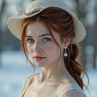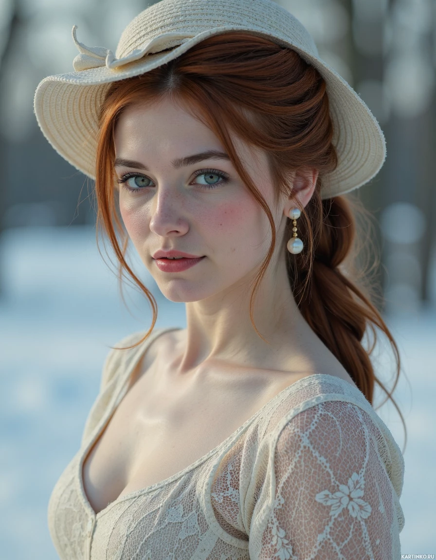 a young woman with striking red hair, styled in loose waves and adorned with a stylish white hat featuring a wide brim and a delicate bow at the front. Her fair skin complements her vibrant locks, while her
