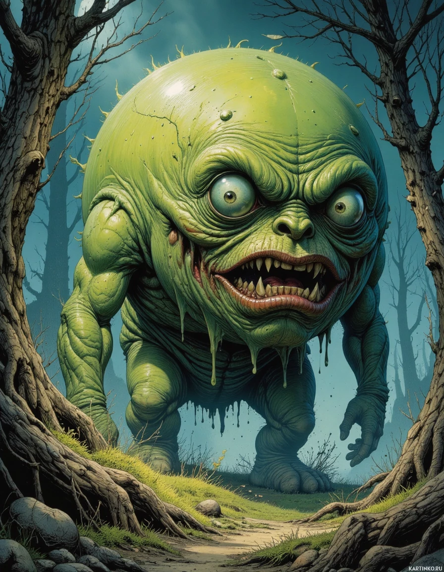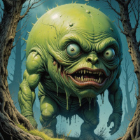 green creature emerging from a forest. The creature has an oversized head with bulging eyes and