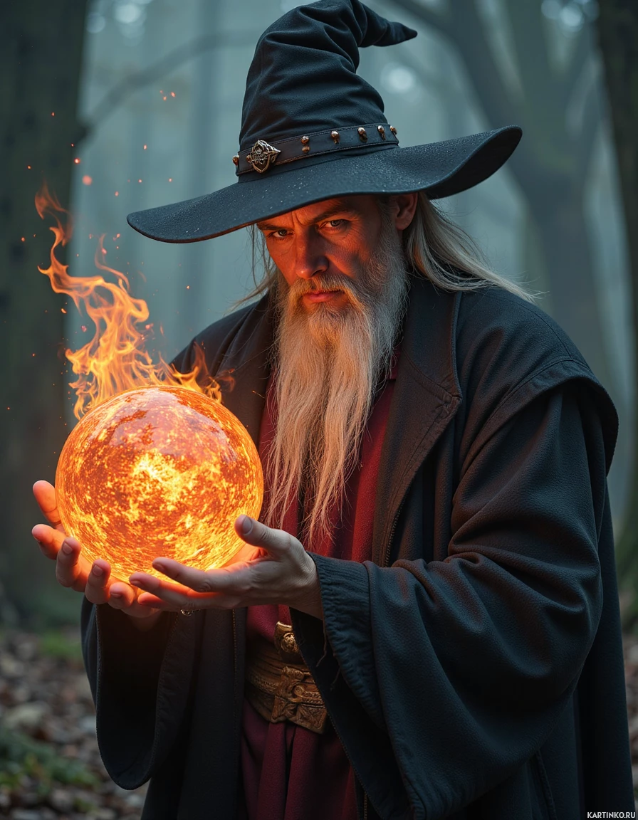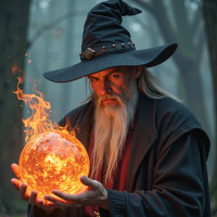 a flaming orb in his hands. The wizard is attired in a long, dark-colored robe with a hood and