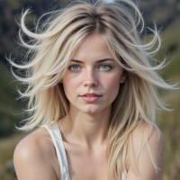 a young woman with long, blonde hair that is blowing in the wind. She has