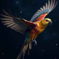 sense of movement and energy. The beak is black, strong and well-defined, and appears to be open as if the bird is squawking or making some other sound. The background of the image is a deep, rich blue that provides a striking contrast to the vibrant colors of the parrot. The stars in the sky are visible through the gaps between the feathers, adding a sense of depth and dimensionality to the scene. Overall, the image captures the beauty and majesty of this magnificent bird in flight, showcasing its remarkable plumage and impressive aerobatic abilities.