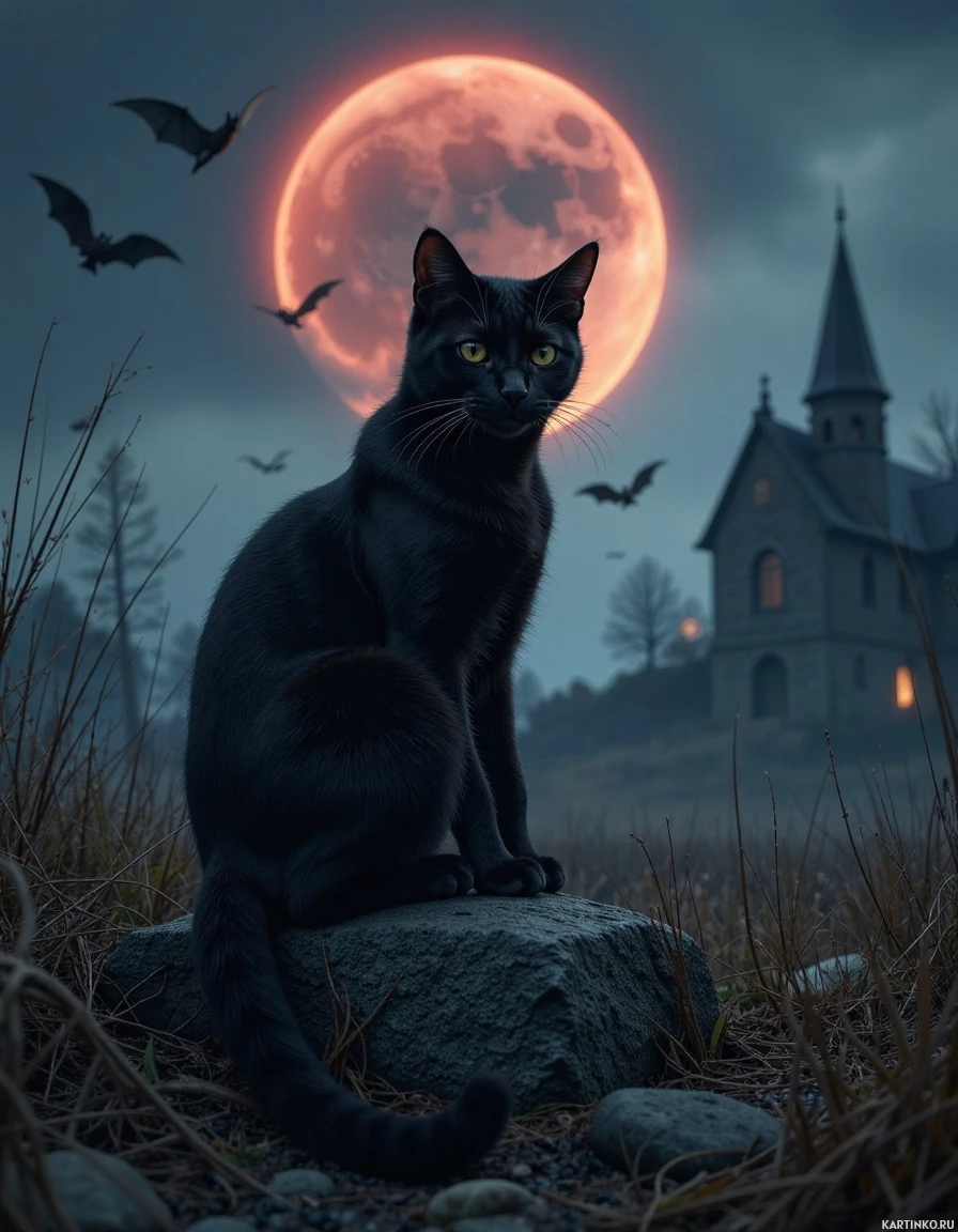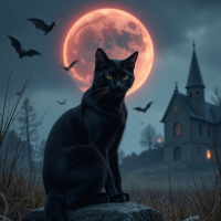 the setting sun. A few bats can be seen flying in front of the moon, adding to the sense of foreboding. To the right of the cat, a large house or church is visible, its windows glowing with an otherworldly light. The building's architecture is reminiscent of Gothic Revival style, with steeply pitched roofs and pointed arches. The overall atmosphere of the image is one of mystery and intrigue, evoking feelings of wonder and curiosity in the viewer. The combination of the cat, moon, bats, and old church creates a sense of enchantment and mystique, drawing the viewer into a world that is both familiar and unknown.