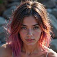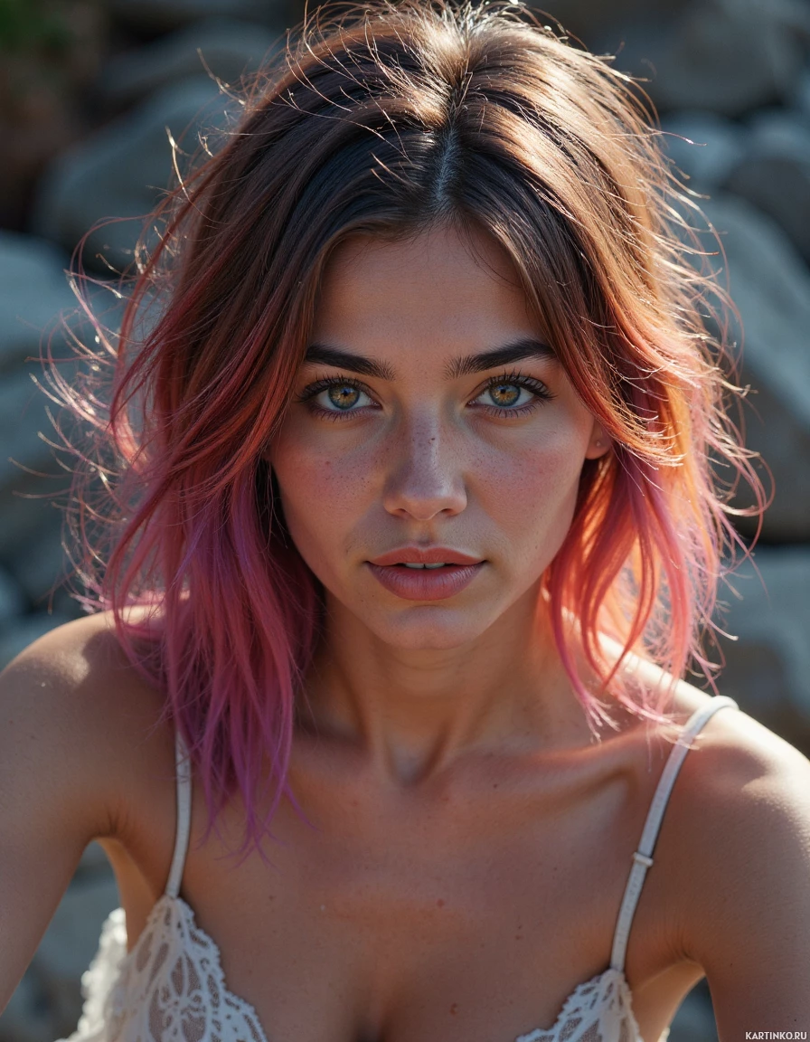 pink tips are visible at the ends of her hair. * She is wearing a white lace top with