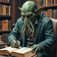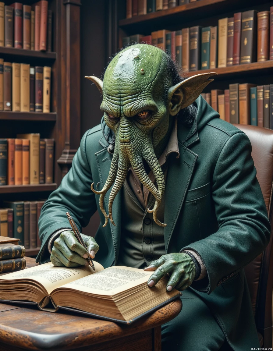 a fantastical creature, resembling an anthropomorphic Cthulhu-like entity, engaged in reading and writing within a library setting. The creature is attired in