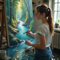 a young woman standing in front of an easel, painting a serene forest scene with a river flowing through it. The woman is positioned to the right side of the canvas, facing left, and has her long