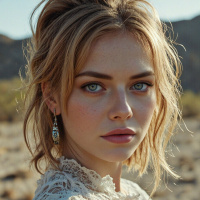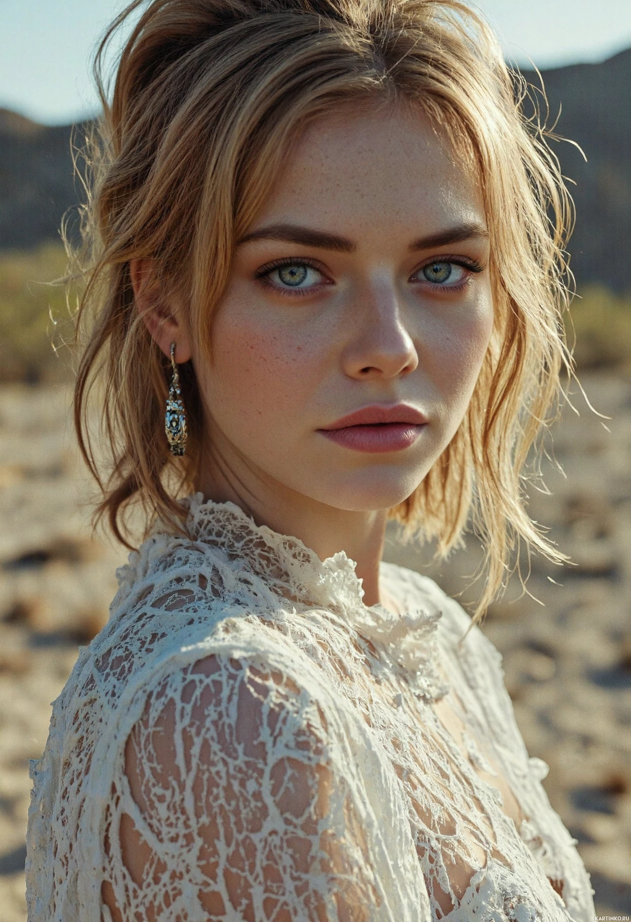 blue eyes are accentuated by her light brown eyebrows, which frame her face. She wears long silver earrings that add