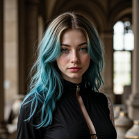 a young woman with long, wavy turquoise hair and green eyes. She is dressed in