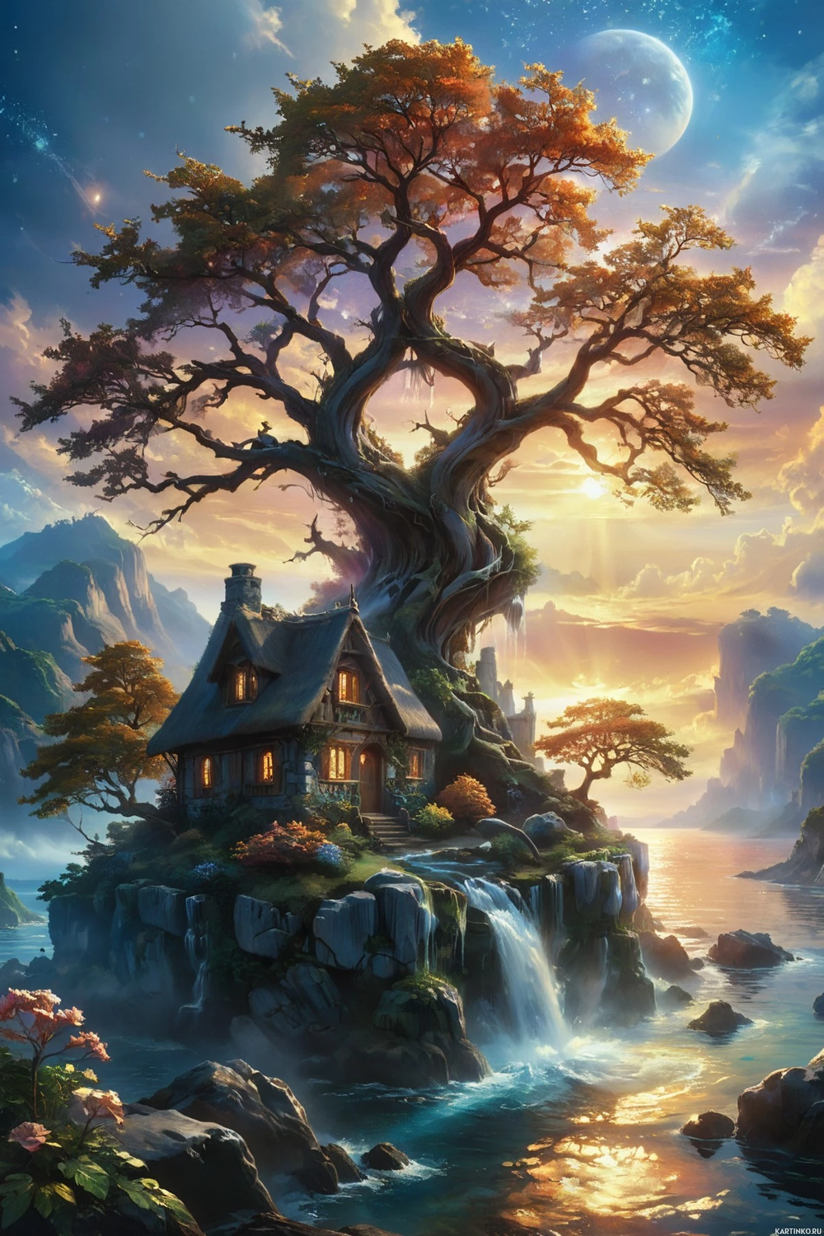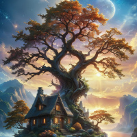 The image depicts a whimsical and fantastical scene. At the center is a large, intricately detailed tree with branches that form a canopy over a cozy,