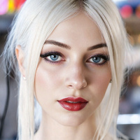 a young woman with striking white hair and blue eyes, gazing directly at the camera. Her long, straight white