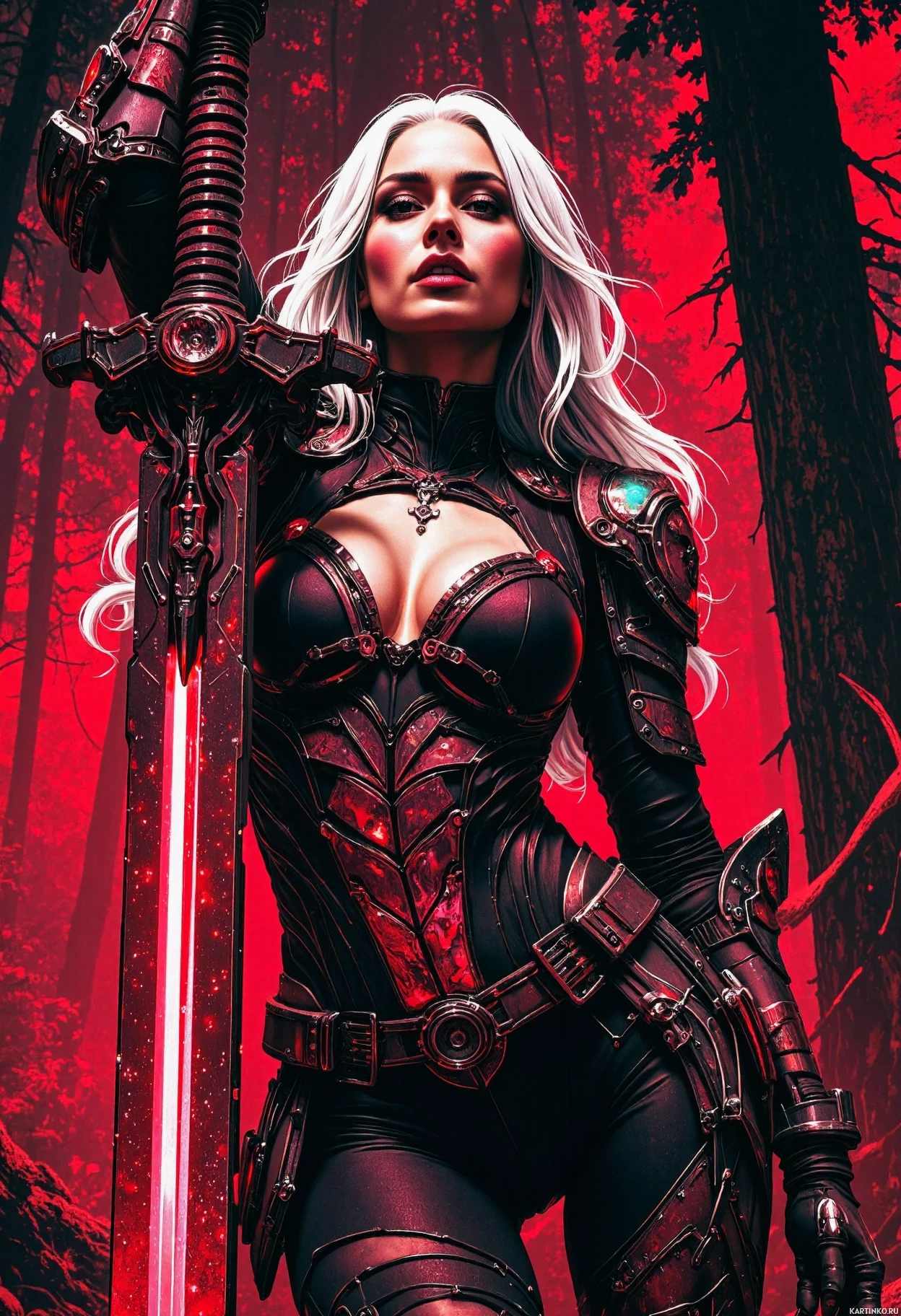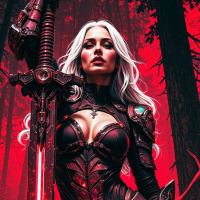 Black leather, covering her entire body * Hand: Holding a sword in her right hand * **Sword:** * Material: Metal * Color: Red glow * **Background:** * Forest with tall trees * Sky: Red