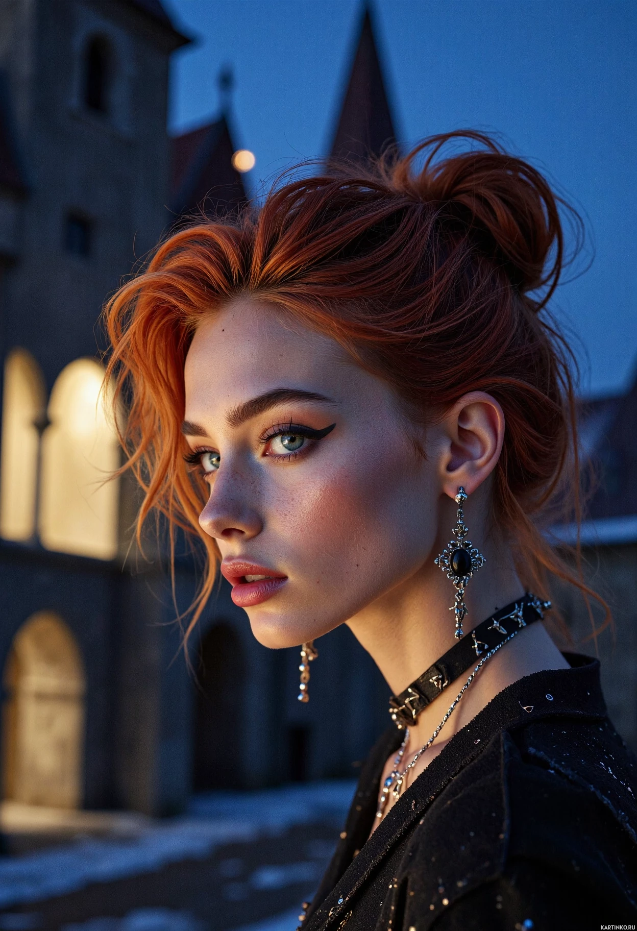 fair skin and piercing green eyes add to her captivating appearance. She is dressed in a black top adorned with silver jewelry, including dangling earrings that feature a cross motif and a necklace resembling a choker. The outfit is completed by a long chain with a pendant. In the background, a blurred building is visible, but its details are not discernible due to the blurriness of the image. The overall atmosphere suggests a nighttime setting, as indicated by the dark