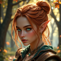 red hair, which is tied up in an elegant fashion, revealing her pointed elf ears. Her attire is a mix of dark green and leather, adding