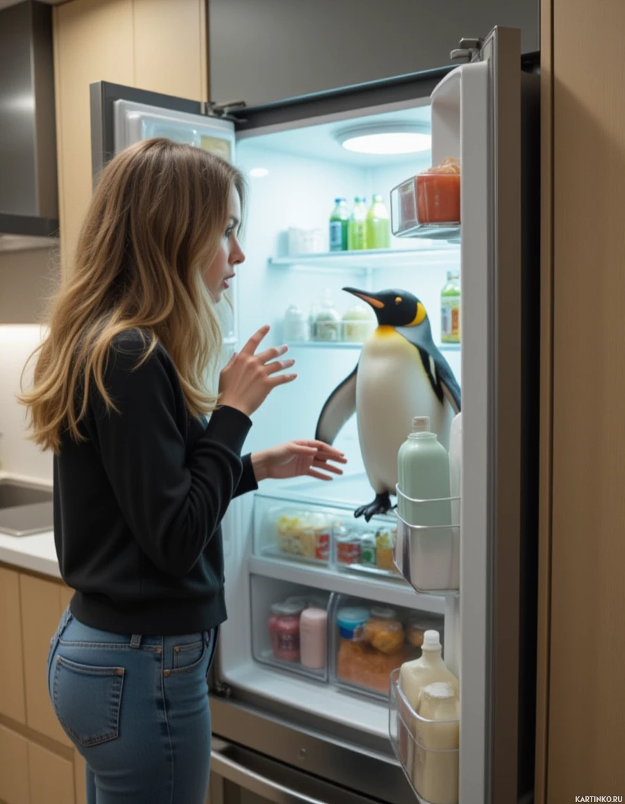 the open door of the refrigerator, seemingly emerging from it. * The background of the image shows a kitchen with light-colored cabinets and countertops. **Overall Impression:** The image suggests that the woman has just opened the refrigerator and was not expecting to see a penguin inside. The presence of the penguin adds