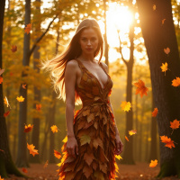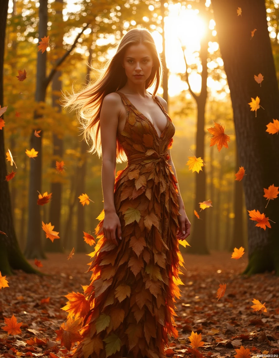 a young woman standing in a forest, surrounded by fallen leaves. She is wearing a dress made of autumnal leaves, with her long
