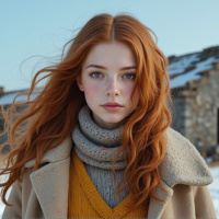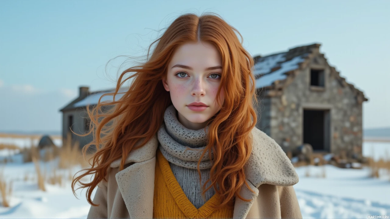 wavy locks that fall down her back and are slightly tousled by the wind. She is dressed in a warm outfit for