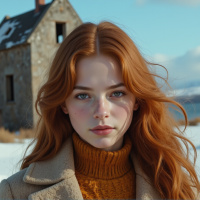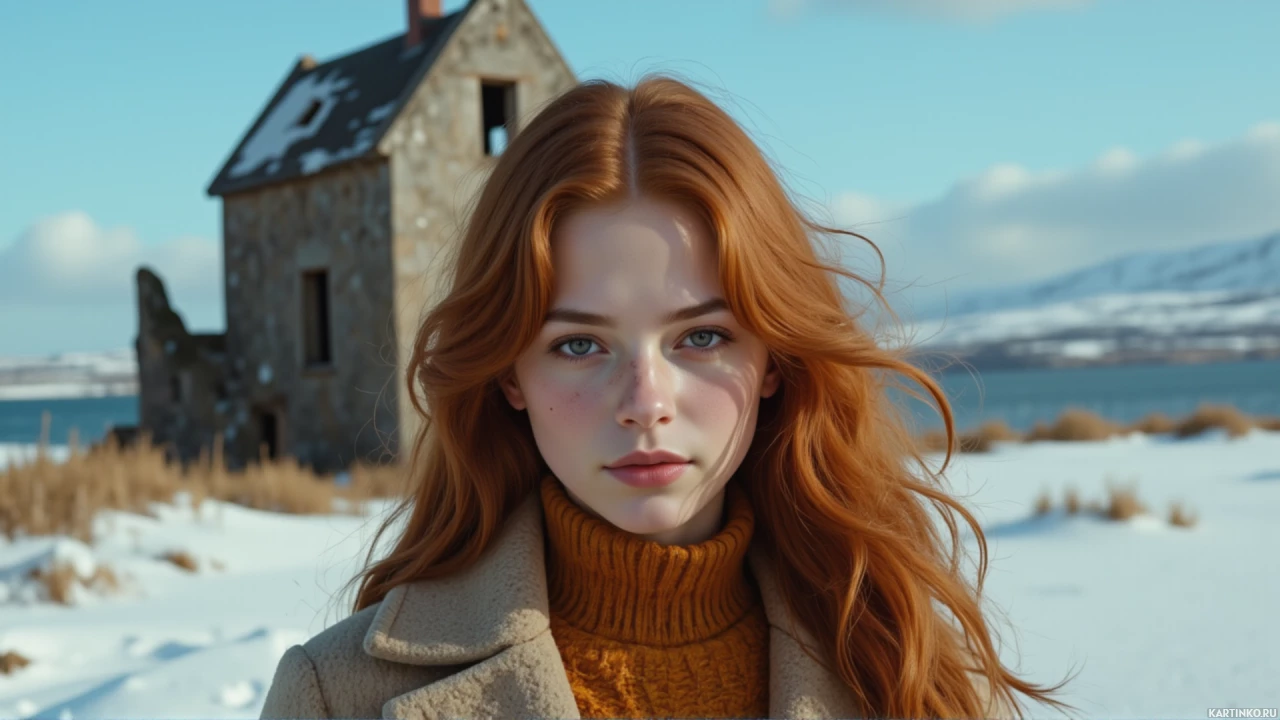 a young woman with striking red hair, standing in front of an old stone building. The woman is dressed in a yellow turtleneck sweater and a beige coat, which complements her