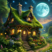 a full moon illuminating the scene. The house is thatched and has