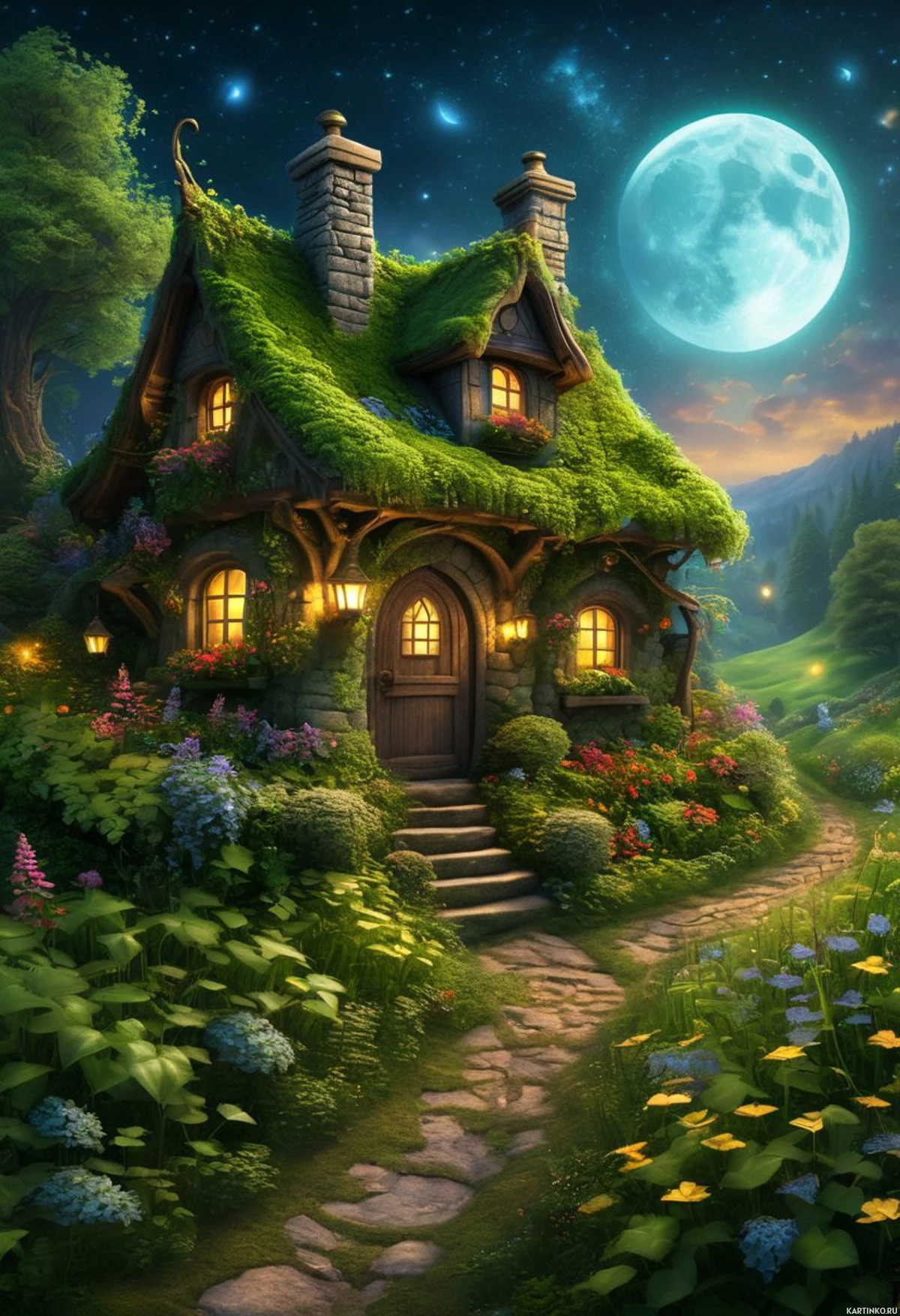 The image depicts a whimsical fairy tale cottage at night, with