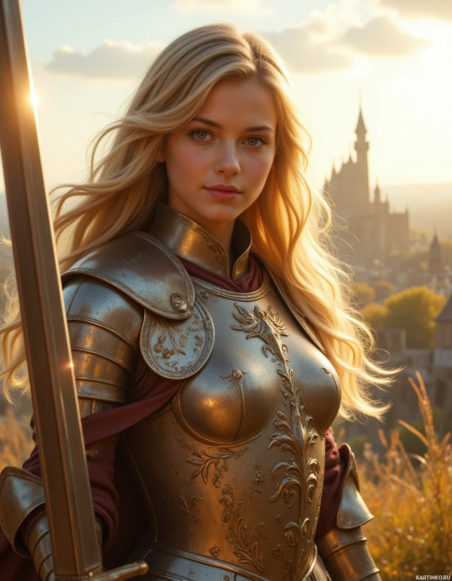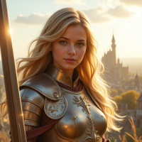 a sense of confidence and determination. The background of the image is blurred, but it appears to be an outdoor setting with a castle or large building in the distance. The sky above is cloudy, adding a sense of drama to the scene. The overall atmosphere of the image suggests that the woman is a warrior or knight, ready for battle or on a quest. Her armor and sword suggest a strong and capable individual, while her confident expression conveys a sense of determination and purpose.