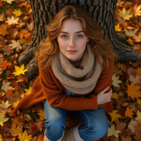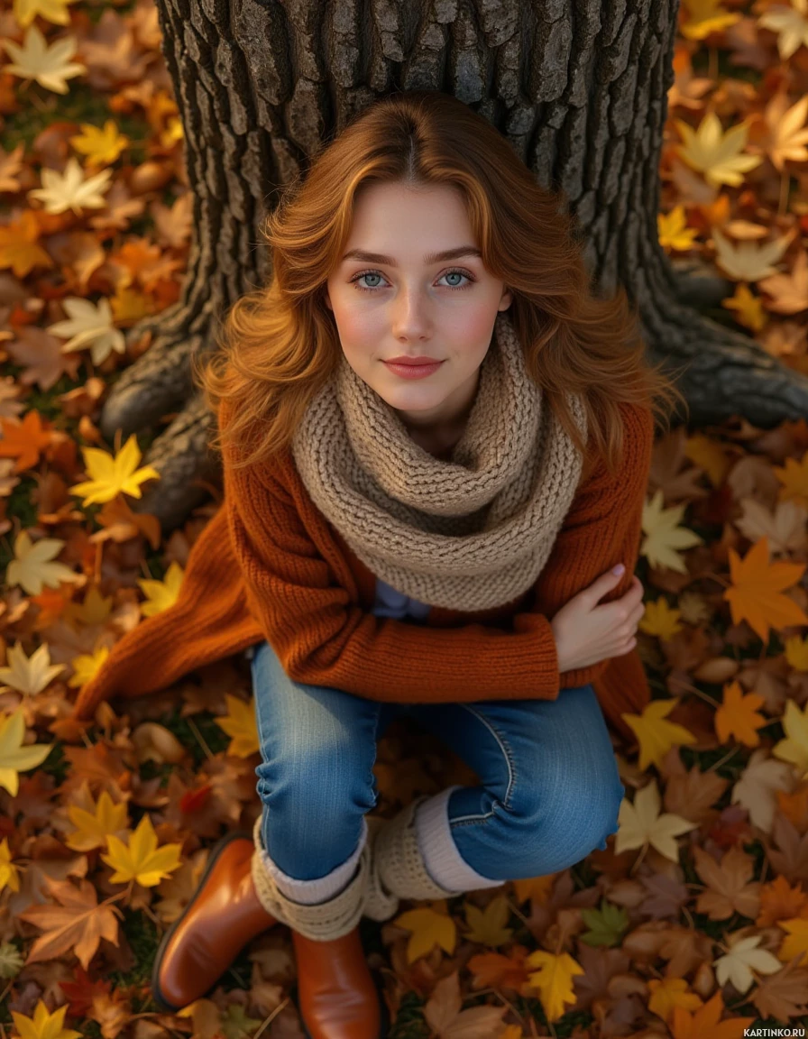 brown boots. In the background, there are yellow, orange, and green leaves scattered on the ground, suggesting that it is autumn or fall season. The overall atmosphere of the image is warm and cozy, evoking