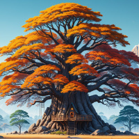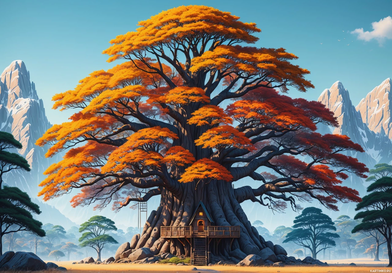capped mountains. At the base of the tree is a small house or hut, built from natural materials such as stone and wood, evoking