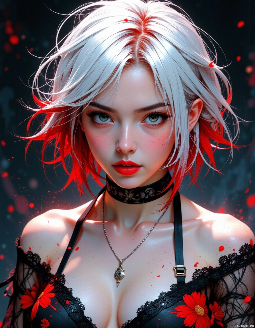 a young woman with striking features and an edgy aesthetic. Her hair is predominantly white, with vibrant