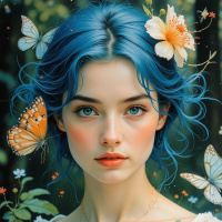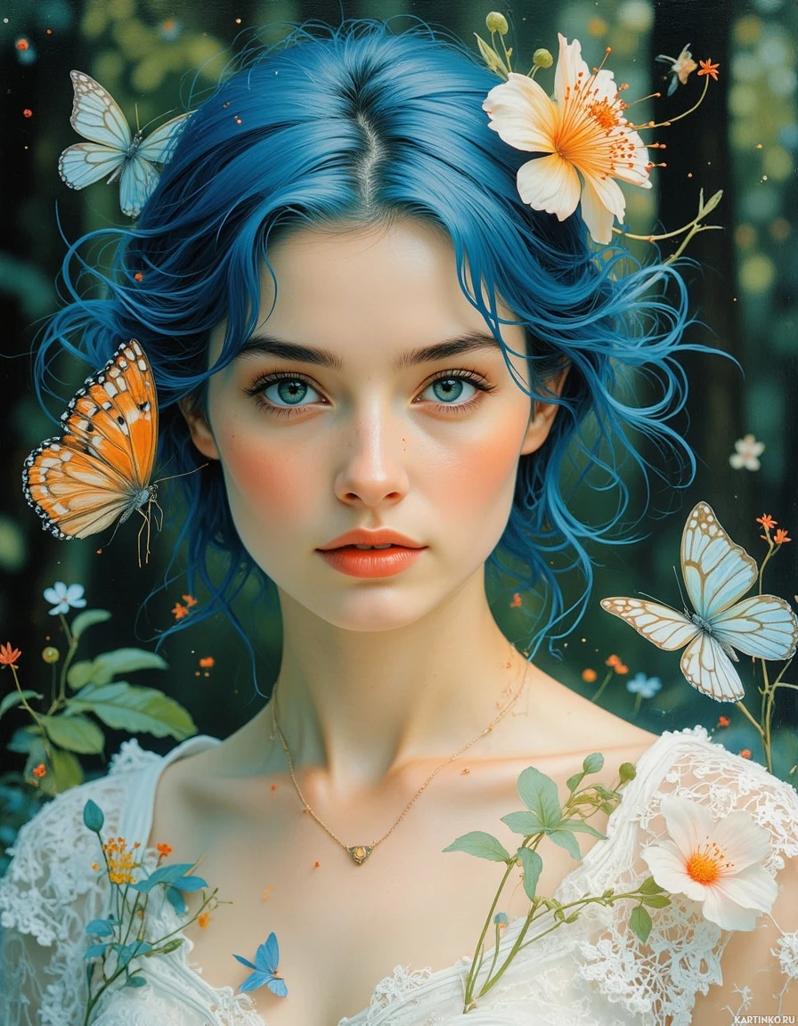 natural beauty. Surrounding her are several butterflies of various colors, including orange, blue, and white, which seem to be drawn to