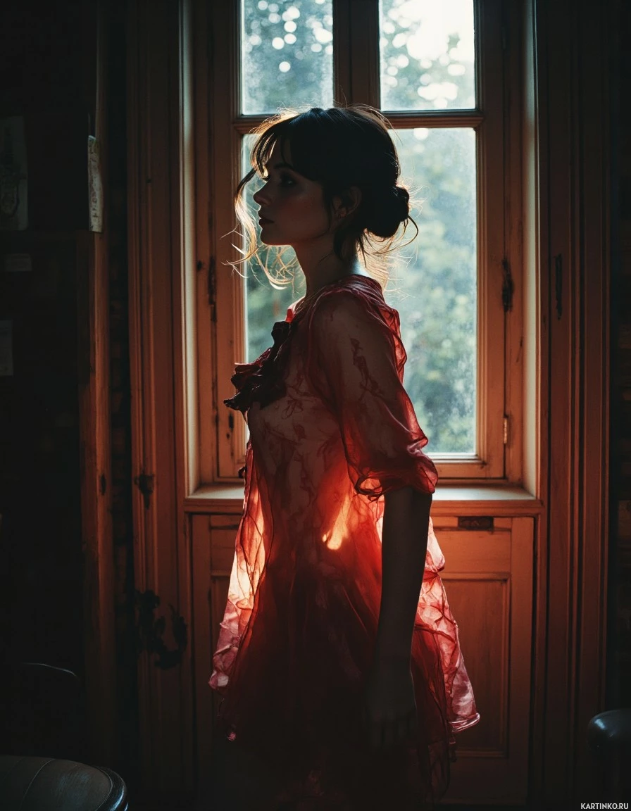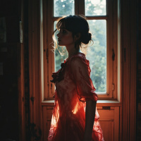 puffy sleeves. The woman's face is blurred, but her expression suggests she is looking out the window. In the background, there are two windows with wooden frames, allowing
