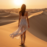 a warm glow over the vast expanse of sand. The sky above is clear and blue, with not a cloud in sight. The overall atmosphere of the image is one of serenity and tranquility, as if the woman has found peace and solitude in this remote