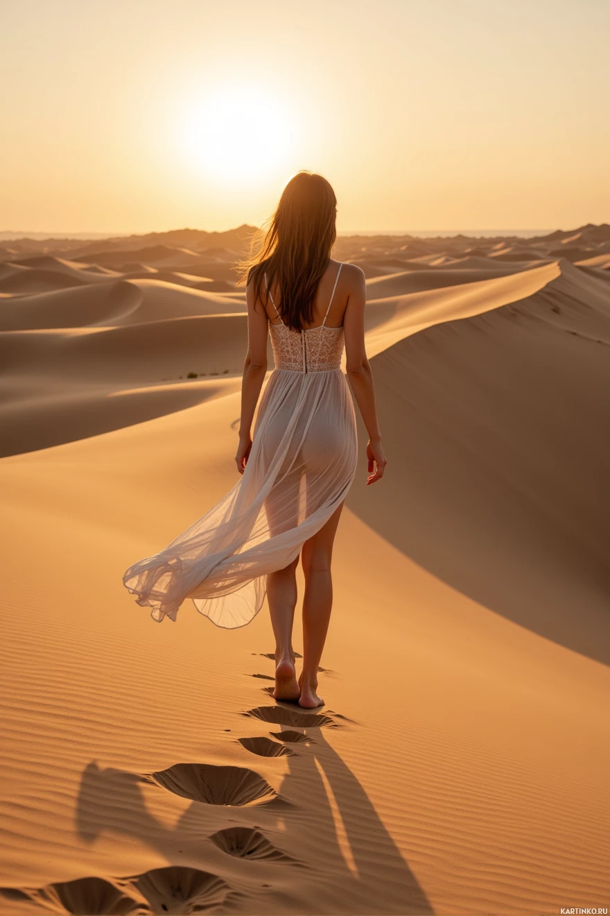a white dress that flows behind her as she stands on the sand dunes. Her long