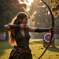 a curved shape, with a string attached to it. The arrow is also made of wood and has a pointed tip at one end and a fletching (feathers) at the other. The girl is holding the bow in her left hand, with her right hand drawing back the string to prepare for shooting. In the background, there are trees and what appears to be an archery target or bullseye. The overall atmosphere of the image suggests that the girl is practicing her archery skills outdoors, possibly at a range or in a forest setting.