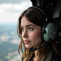 brown hair and appears to be concentrating or perhaps enjoying the flight experience. Her attire consists of