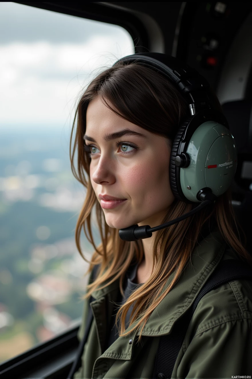 casual clothing suitable for outdoor activities. In the background, through the cockpit window, you can see