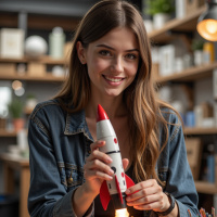 a young woman with long brown hair, wearing a denim jacket, sitting at a desk and holding a toy rocket ship. She is smiling and looking directly at the camera. In the foreground, there are