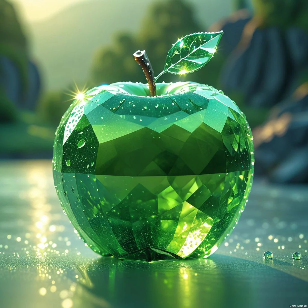 a glass cage with a gold-like finish, giving it an ornate appearance. The apple's surface appears to be made of facets similar to those of a crystal or gemstone. The background depicts a serene landscape with mountains and trees under a softly lit sky, suggesting that the photo might have been taken in